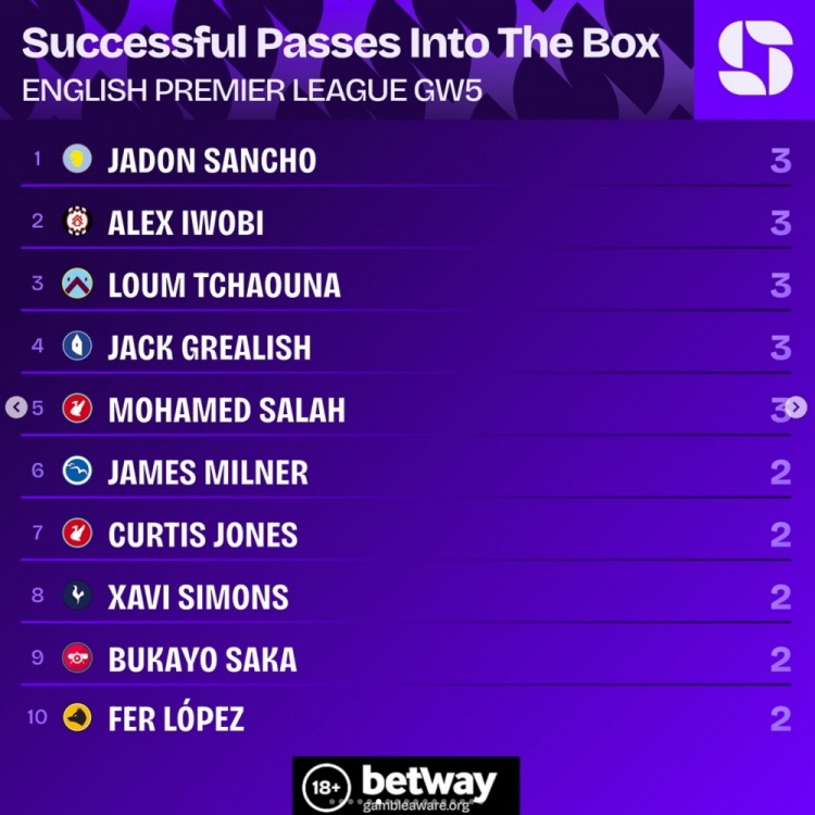 英超第5轮成功传球进禁区榜:桑乔等5名球员各3次,本轮最多